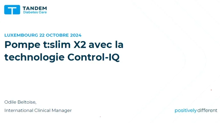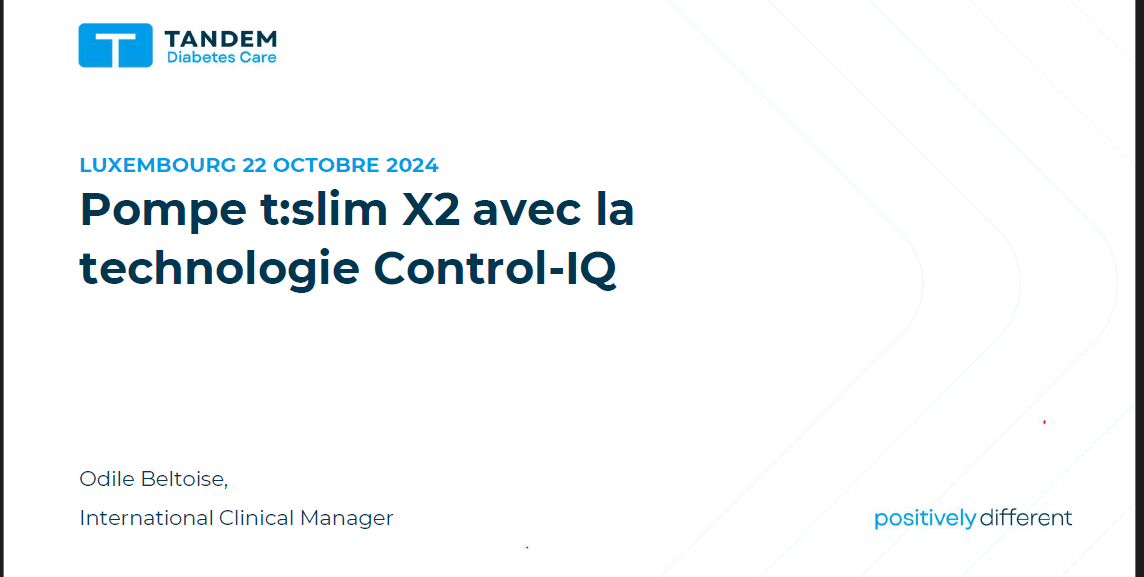 Présentation sur la pompe t:slim X2 avec la technologie Control-IQ faites au Luxembourg le 22 Octobre 2024.